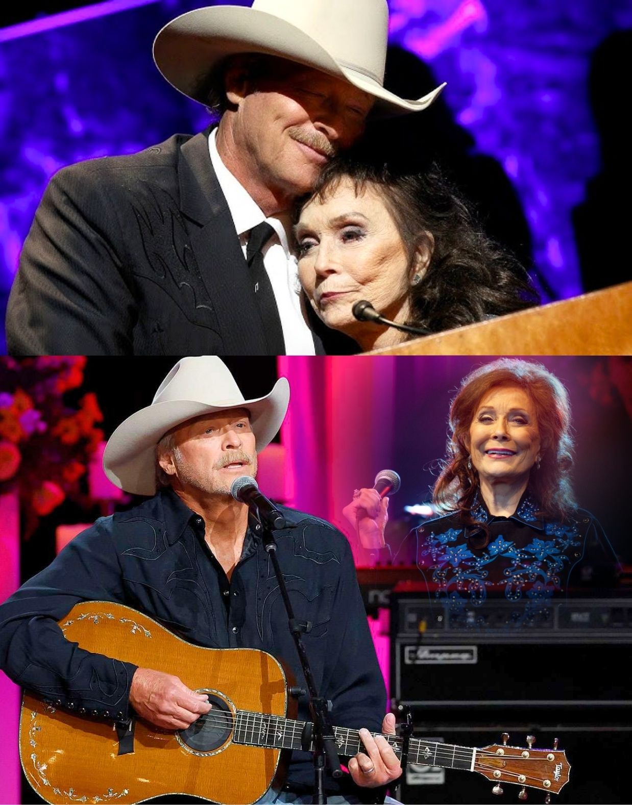 There was no spotlight, no background band, no grand production. Just Alan, his guitar, and a reverence that filled every corner of the room. As his voice carried the familiar words — “Well, I was born a coal miner’s daughter…” — the screen behind him began to glow with images of Loretta: in her sparkling gowns, onstage with Conway Twitty, smiling in the Tennessee sunlight outside her ranch at Hurricane Mills.