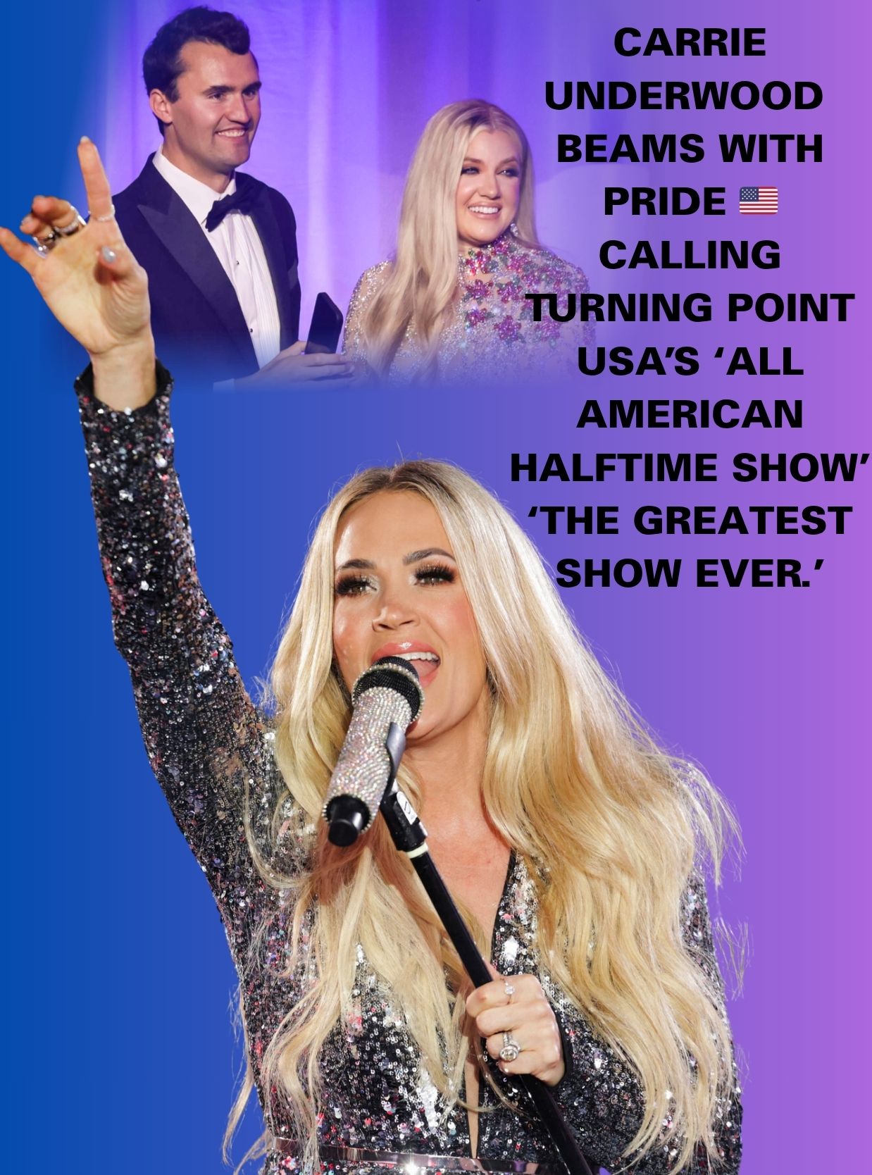 It was a moment that captured everything fans love about Carrie Underwood — sincerity, passion, and an unshakable love for her country. When the country superstar heard about Turning Point USA’s “All American Halftime Show,” her reaction was as genuine as it was powerful. Standing backstage, surrounded by bright lights and flag-themed stage décor, Carrie’s face suddenly lit up with unmistakable excitement. Her eyes sparkled, her smile widened, and before anyone could say a word, she exclaimed that it was “the greatest show ever” — calling it “a celebration of who we are as Americans.”