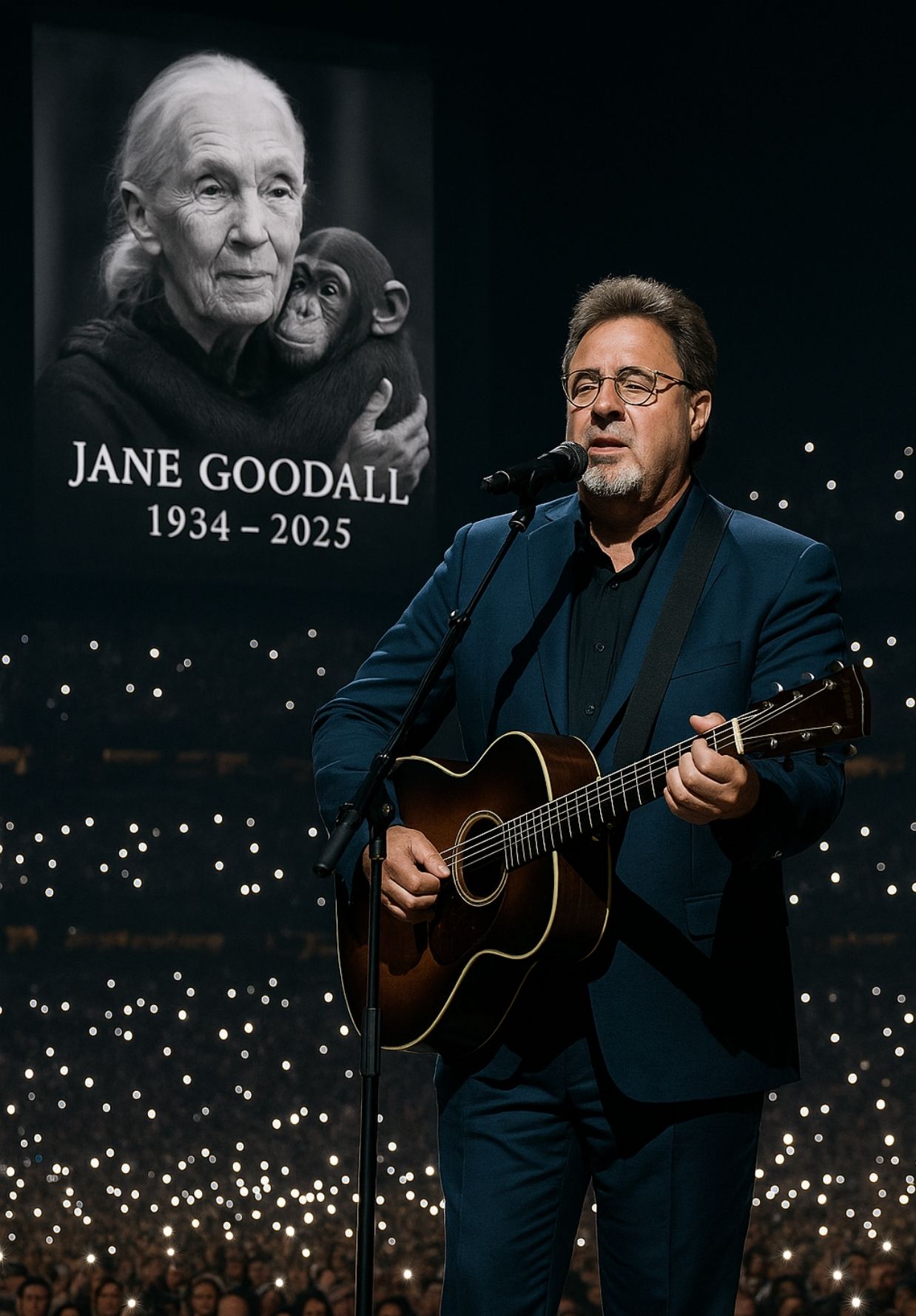 On a stage filled with silence and reverence, Vince Gill stepped forward to honor the life of a woman whose work transcended science and became a moral compass for the world. Jane Goodall, the legendary primatologist, conservationist, and advocate for wildlife, had passed away at the age of 91. Her death sent ripples of grief across the globe. And on this night, under soft lights and before an audience gathered in solemnity, Vince chose to pay tribute in the way he knew best — with a song.